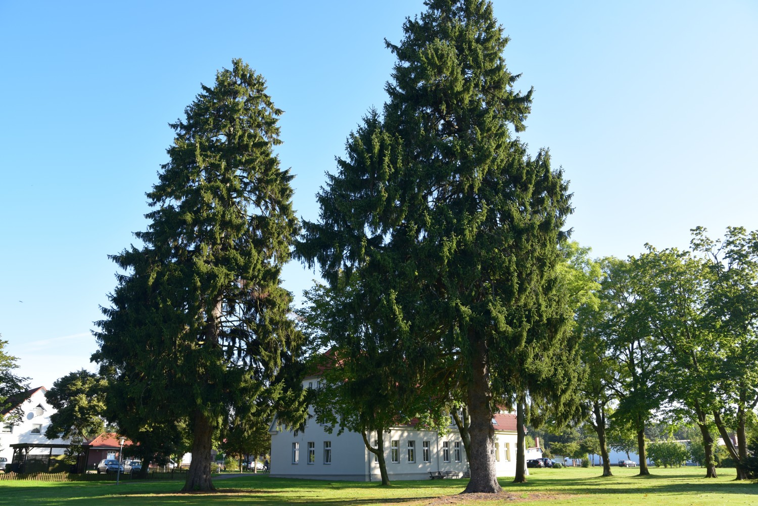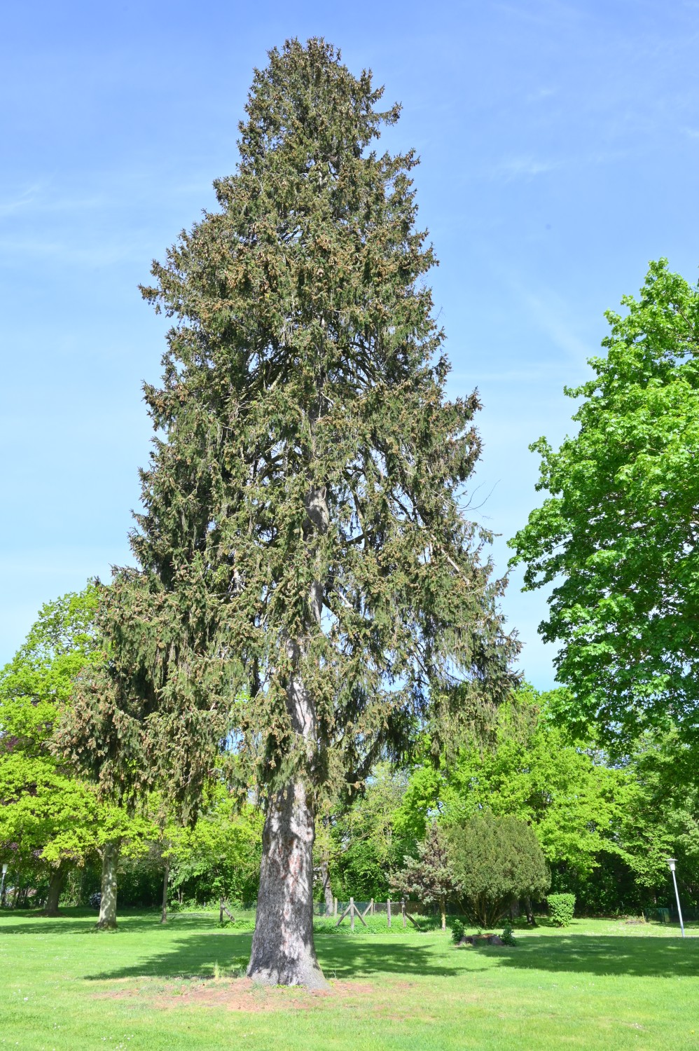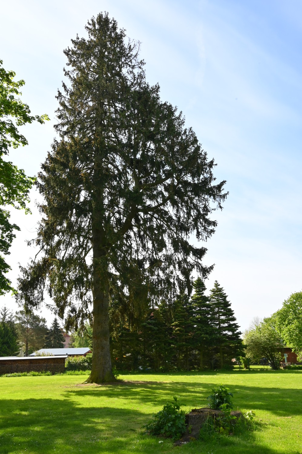Mai 2024: Nur noch südliche von ehemals zwei starken solitären Fichten erhalten, nördlicher Baum nur noch Stubben. Im Mai 2017 waren noch beide Fichten vorhanden, Umfänge 363 cm nördlicher Baum und 356 cm südlicher Baum.