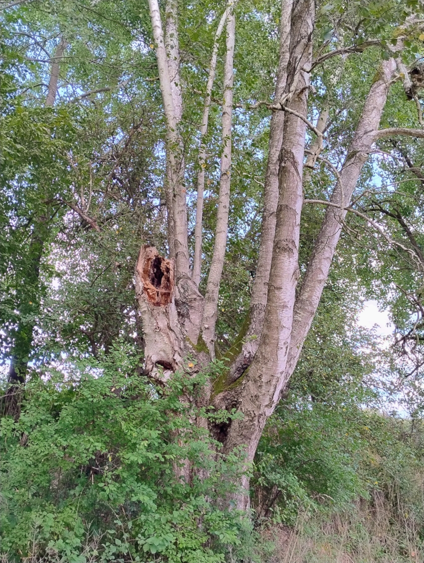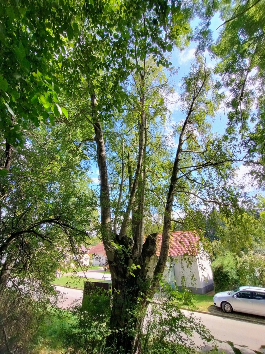 Bedeutende Schäden am Stamm, geschützter Stand im Unterwuchs neben Pappeln und Eschen. Entwässerung vom Feld nebenan.
