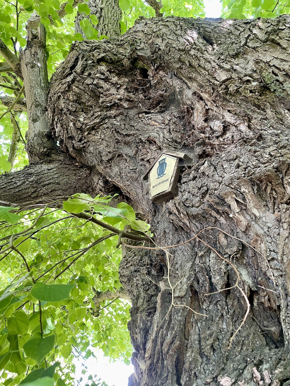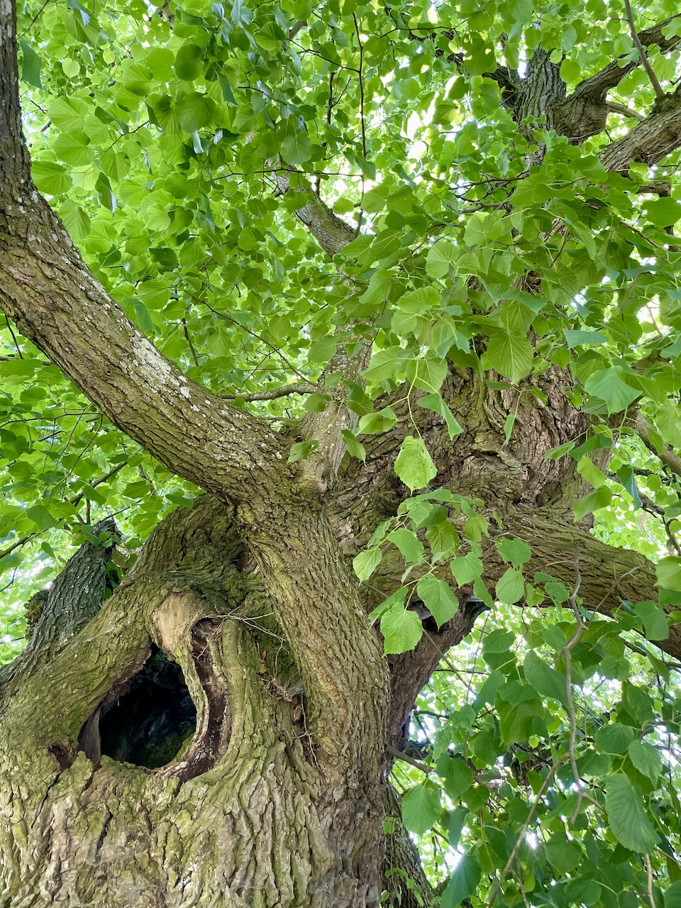 Stark beuliger, mit Verstärkungswurzeln verwachsener, hohler und stark knorrig-beuliger Stamm, der sich in ca. 4 m Höhe in mehrere Starkäste verzweigt. Deutliche Alterserscheinungen, wie bei Linden üblich.
