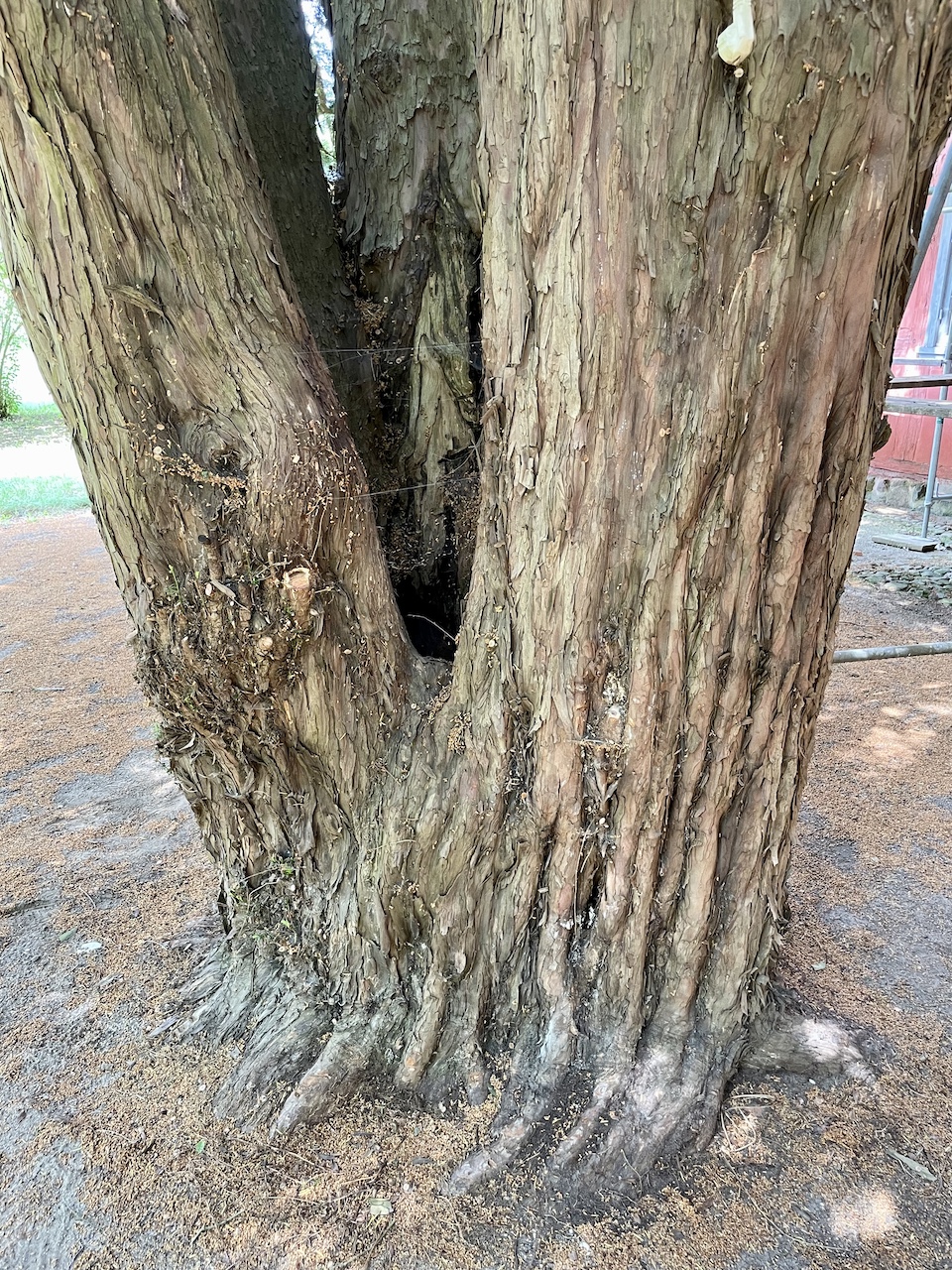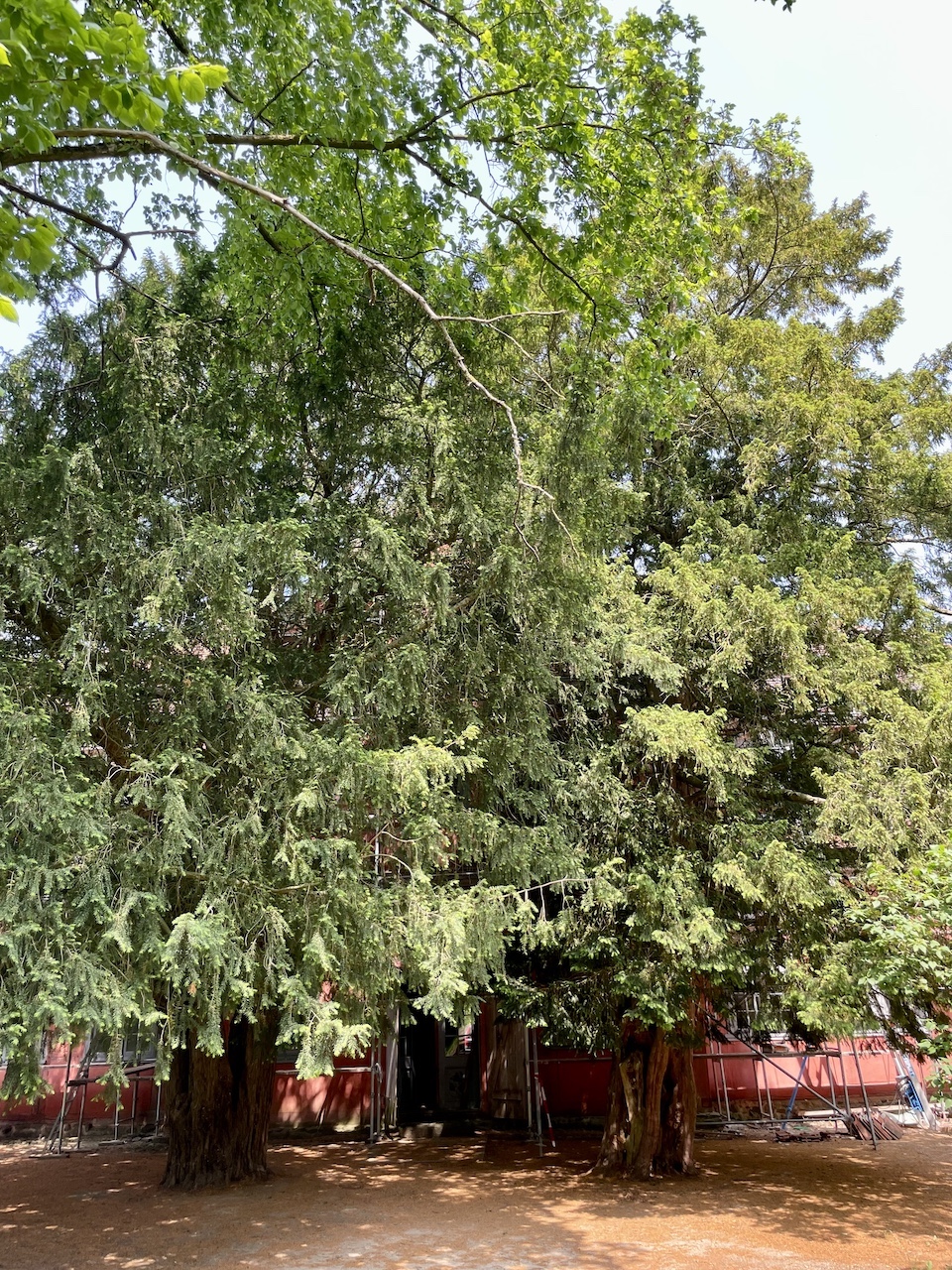 Zwei Bäume, gleich groß und zusammen infolge Kronenschlusses ca. 15 m breit. Eibentypische Mehrstämmigkeit ausgebildet.