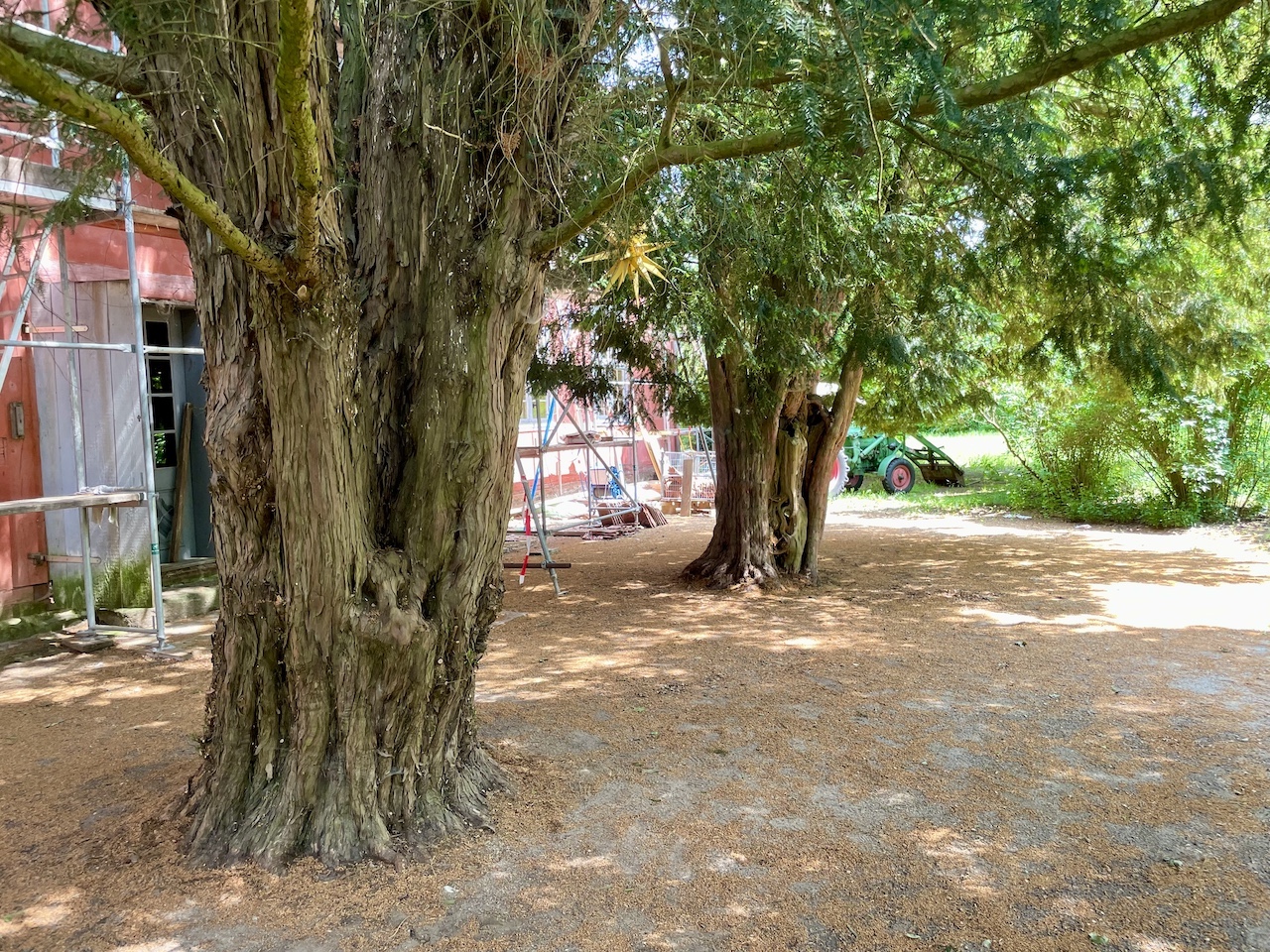 Die Eiben messen 4 m und 3,41 m in 1,3 m Höhe. Die Taille des in Bild 3 rechten Baumes, der 4 m misst, beträgt in 0,7 m Höhe 3,73 m.