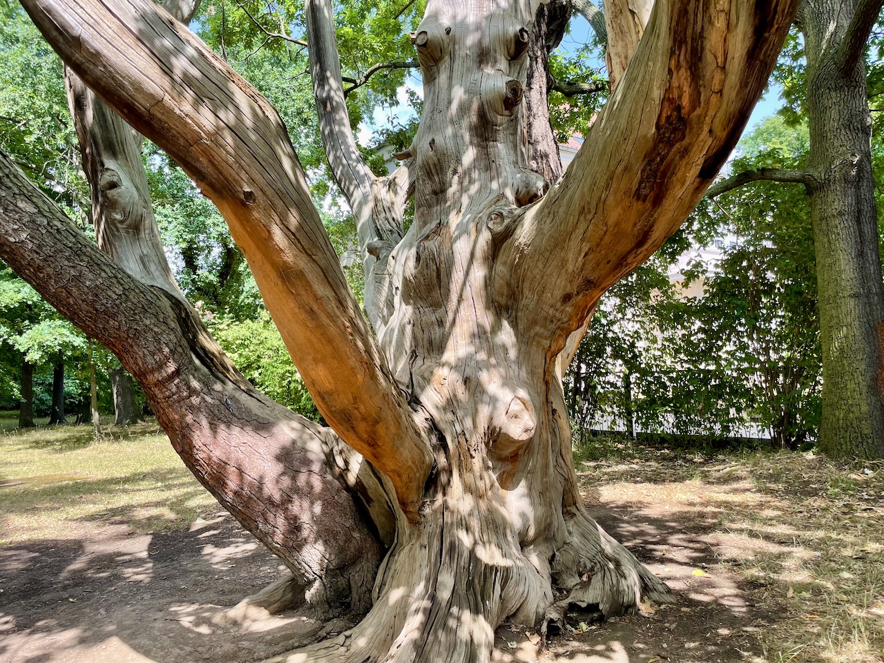 Vom Boden weg mehrstämmig, geschwungen und gebogen, nach oben auftstrebende Kronenstämme, alle bis auf einen einzigen abgestorben Stamm fast vollständig entrindet, der Baum wird nicht mehr lange - Stand 2022 - (über)leben.