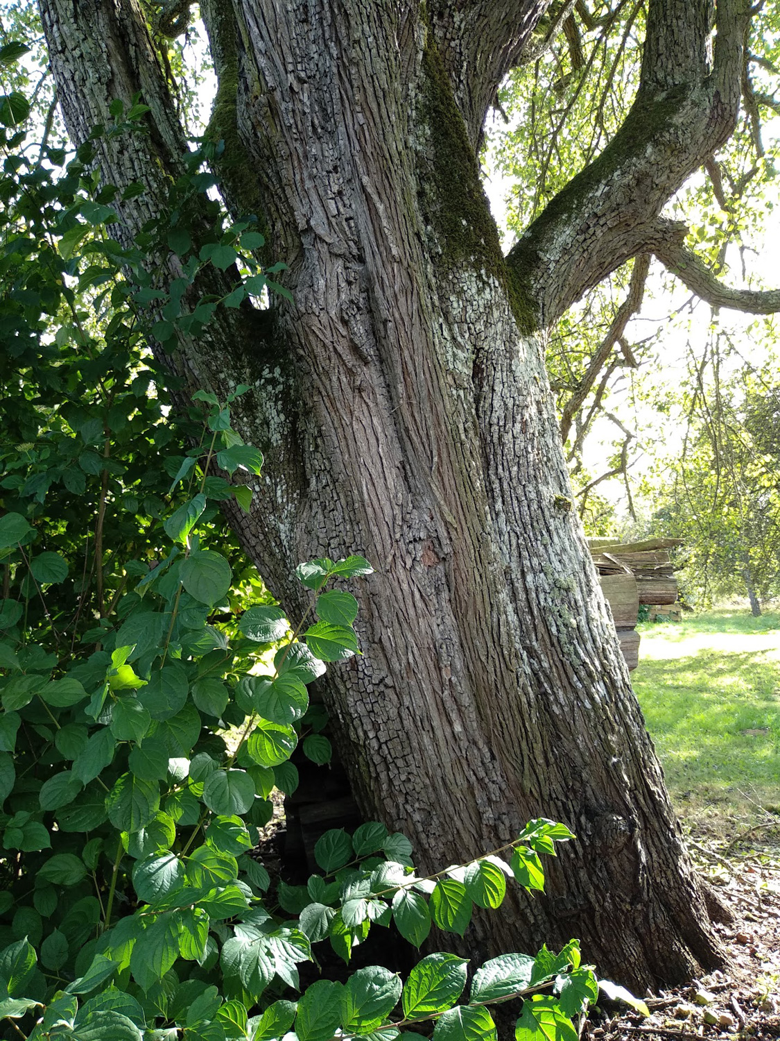 Baum ist von mehreren Holz-Lagerplätzen umgeben, kommt deshalb nicht so zur Geltung. 2025 ist ein Holzstapel am Baum entfernt, deshalb nun Messung bei 130 cm Höhe rechtwinklig zur Stammachse möglich.
